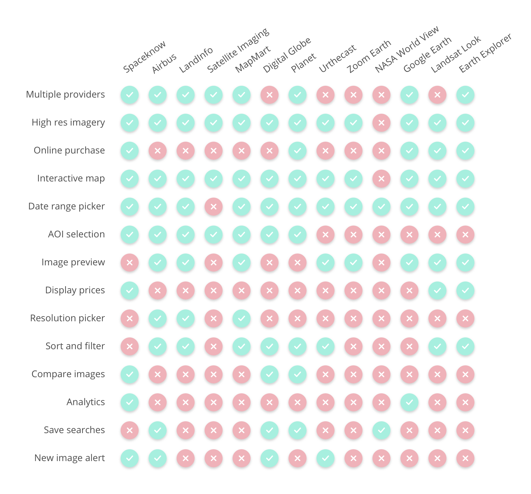To survey the existing solutions in the market, we identified and examined 13 public and private services that provide satellite imagery and conducted a competitive analysis.